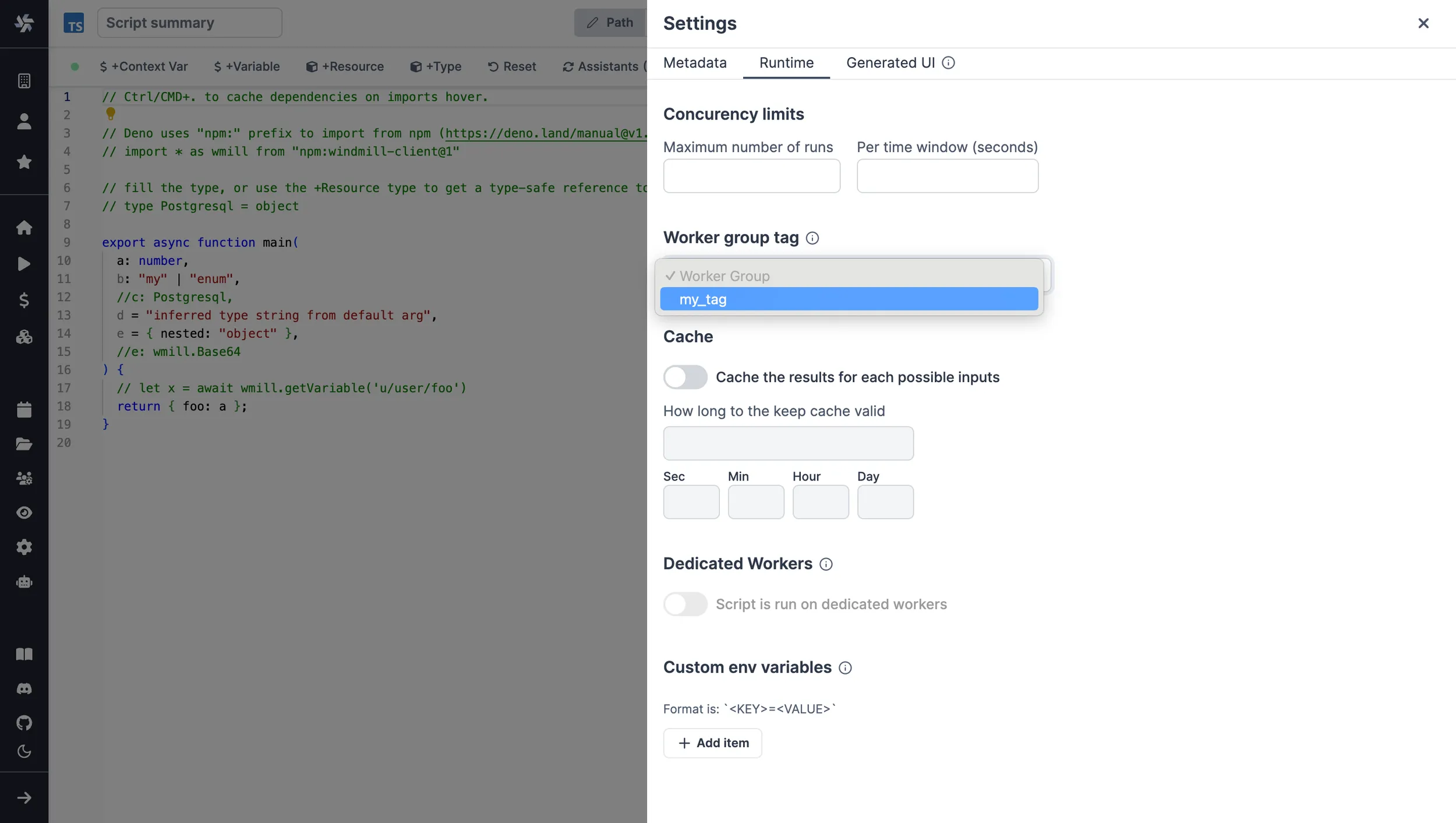 For scripts deployed on the script editor, select the corresponding worker group tag in the settings section.