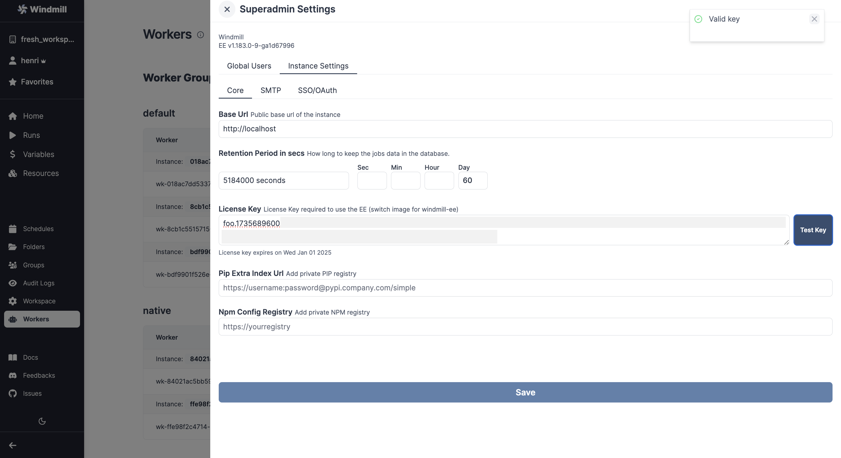 To enable the license key, switch from the windmill image to the windmill-ee image in both the server and workers. From the Instance settings, pass the license key, "Test key" and save settings.