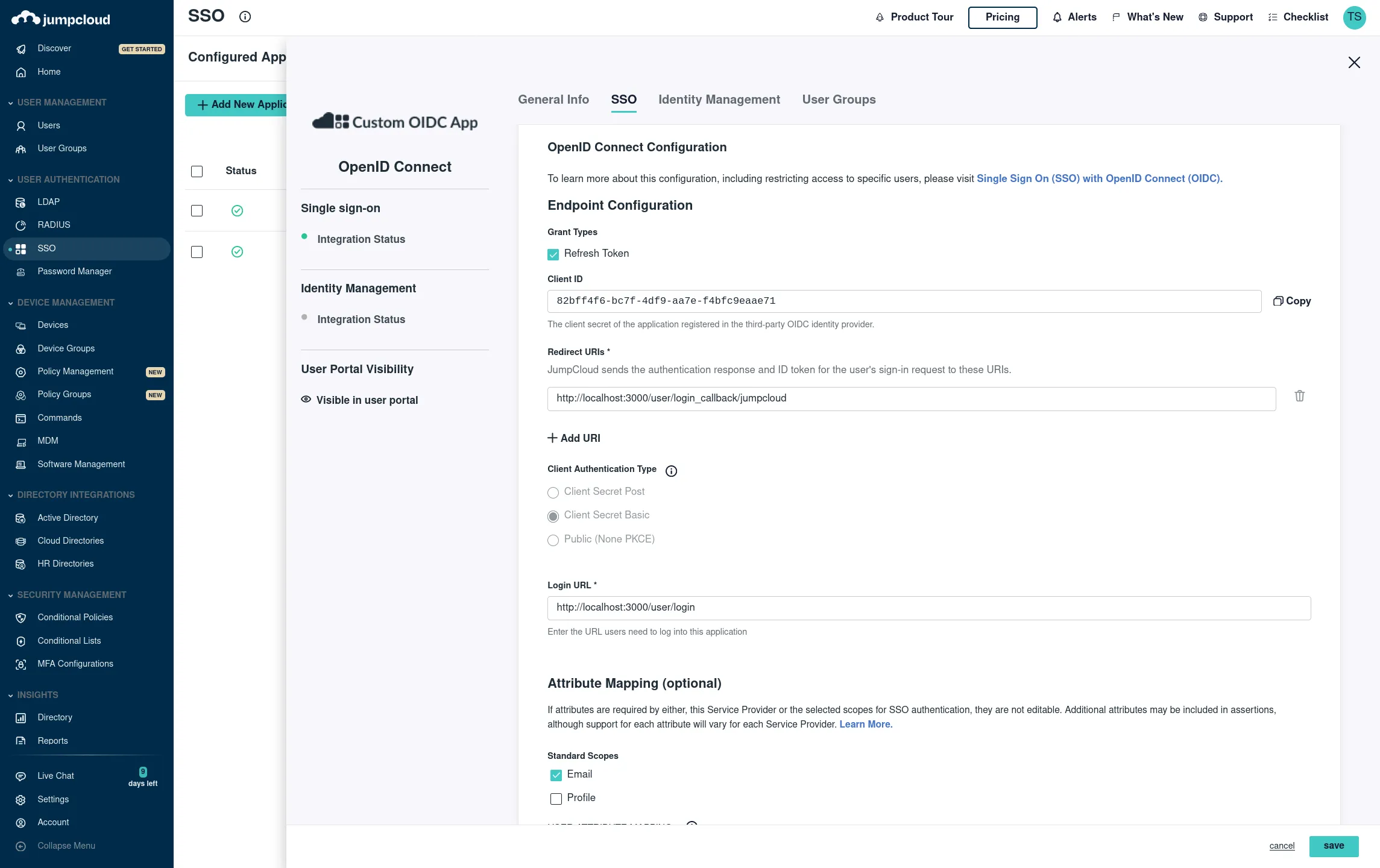 Instance settings 'SSO OAuth' - - 'SSO' - Toggle "jumpcloud" and set client id and client secret, and "Client Authentication Type" to "Client Secret Basic"